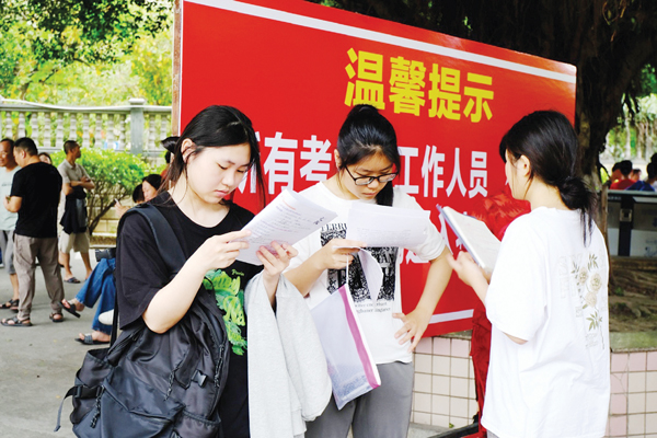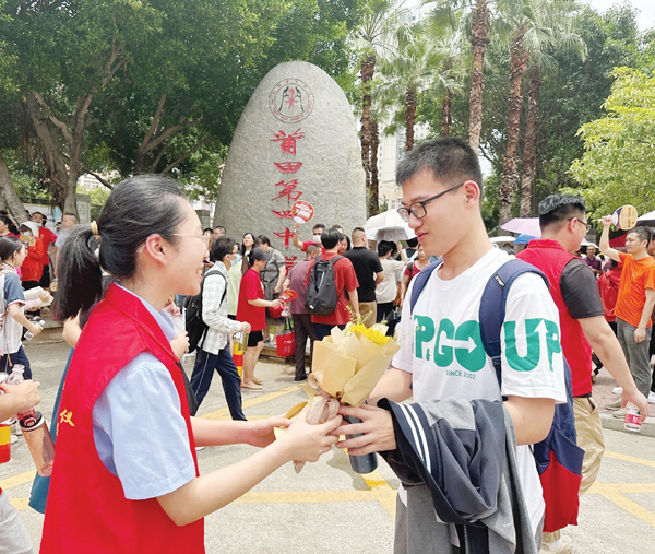 三载砥砺笔为剑,高歌壮行待凯旋。6月7日,2023年全国普通高考正式拉开帷幕,今年我市共有2.4万多名考生参加高考,全市设立了6个考区,21个考点,933个考场。记者在市区部分考场外走访时看到,高考首日,不少陪考的家长,或穿上红色衣服,或身着旗袍等寓意“开门红”、“旗开得胜”,为考场内的孩子加油鼓气。在各考场外,不少爱心商家、企业和单位也纷纷搭起帐篷,建起临时“爱心驿站”,为考生及送考家长免费提供饮用水、扇子。记者在莆田一中考场外看到,部分“爱心驿站”还贴心地为考生提供尺子、考试笔以及藿香正气水、清凉油等。同时,公安、交警、志愿者等冒着高温酷暑,坚守岗位,各司其职,为学子加油,为梦想护航。