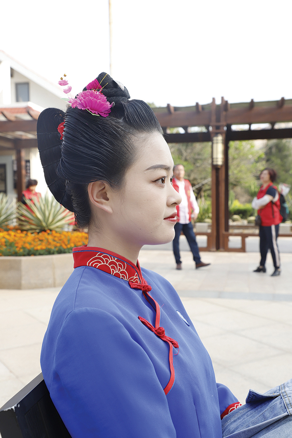 “帆船头、大海衫,红黑裤子寄平安”是湄洲女的传统形象。帆船造型的湄洲女发髻与大海衫、红黑裤子并列为湄洲女服饰的三大显著特征,此发髻相传为妈祖生前亲自设计。妈祖一生未嫁,将身心许于大海,独创的发髻是妈祖短暂一生中“帆髻示志”的象征。“髻为帆、针为锭、线为缆”,湄洲女发髻中各个配饰都有着独特的寓意。在船帆式的发髻中,髻代表帆,银针代表锚,红头绳代表缆绳,波浪形的发夹代表船桨,寓意“妈祖保佑四海万民一帆风顺”。