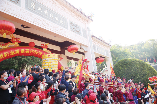 妈祖信众谒祖进香也是世界非物质文化遗产“妈祖信俗”的重要组成部分。世界各地的妈祖庙从湄洲妈祖祖庙恭请妈祖神像和取香灰的仪式分别称为“分灵”和“分炉”,与之相对应的信俗是“谒祖进香”,也称为“妈祖回娘家”。谒祖进香活动可简可繁,简单的只需捧妈祖神像回湄洲妈祖祖庙过一下炉,隆重的则要组织护驾队伍,像妈祖出游一样,浩浩荡荡回到湄洲妈祖祖庙,举行庄重的谒祖进香仪式。