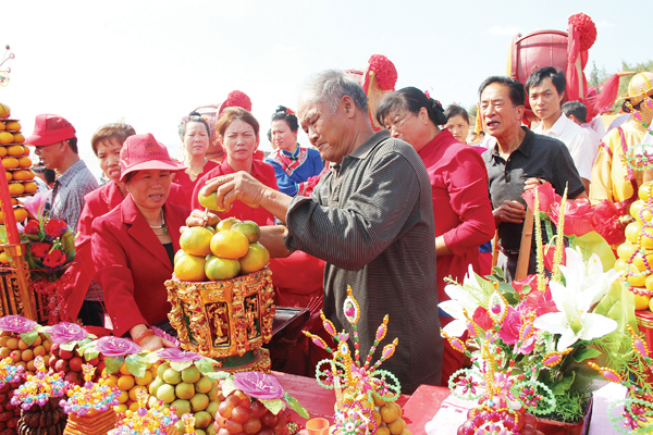 筵桌是以湄洲岛人们生活当中积累下来的一些典故为原型,取海上的鱼类品种为贡品。这些活灵活现的面塑海鲜是以面粉、米粉、豆皮等素食作为原料,经过多重工艺雕塑而成。