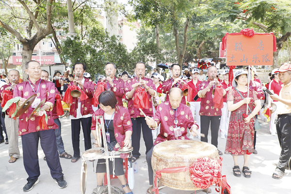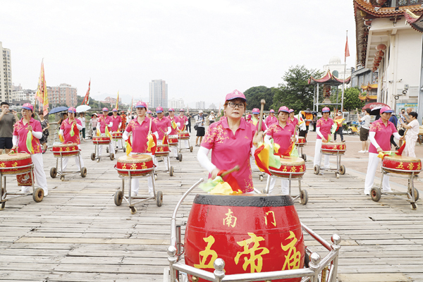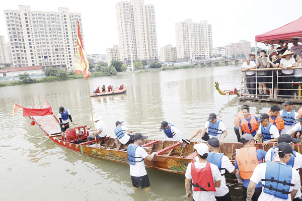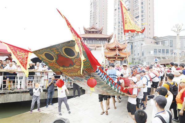 上午11时许,参加本次祭江仪式的贺船在众人的抬举下缓缓入水,大家挥臂划桨,和着锣鼓的节拍划向虎啸潭戚继光纪念馆附近集结。
