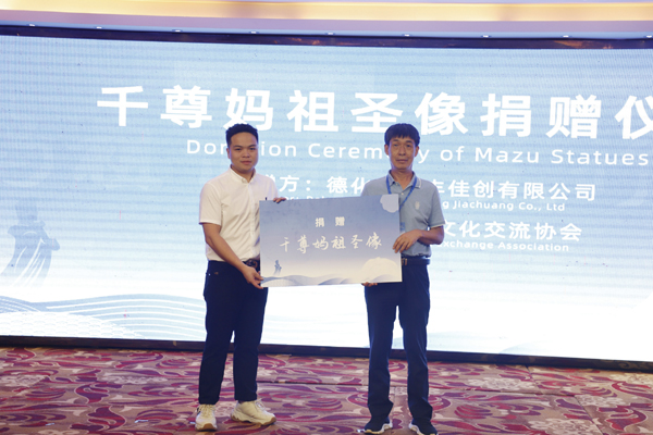 当天活动现场,还举行了千尊妈祖圣像捐赠仪式。德化恒丰佳创有限公司向中华妈祖文化交流协会捐赠千尊妈祖圣像,再一次将“立德、行善、大爱”的妈祖精神推向世界。