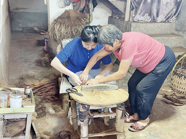 当天,实践队成员还前往白沙镇广山村了解蓑衣的历史与构成,体验了蓑衣的制作过程。蓑衣的样式看起来简单,实际上有领口、披肩、前裙等多个部位,不同部位的编织手法都不一样。妇联负责人范仙花向实践队成员们介绍,编织蓑衣的第一步是制作棕线,将棕叶在钉耙上反复用力拉扯,把扯下来的絮状物揉搓成线,再用脚细的棕线碾成棕绳,这样才能有足够的强度来进行编织;做蓑衣最重要的是领口,将几十张棕叶反复折叠后用棕线缝制塑形不仅需要很大的力气,也非常考验眼力,一不小心就会扎到手;其他部位也都是靠棕线,将棕树皮一针一线缝制在一起;纯手工缝制一件蓑衣至少需要用掉上百片棕树皮。