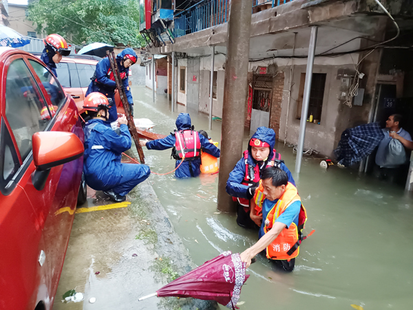 到达现场后发现房屋积水较深,建筑物为老旧房屋,随时存在坍塌危险,被困人员为一家老幼,若不及时救援随时存在生命危险。现场带队指挥员立即下达作战命令,救援人员分两组进行救援,一组人员深入内部房间将老人及幼儿背出转移到皮筏艇上,另一组人员将门窗破开进行营救。经过半个小时的紧张救援成功将9名被困群众全部转移至安全地带。