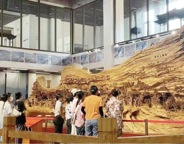 莆田木雕是一门综合性极强的传统民间艺术,具有独特的艺术价值。春晖木雕艺术馆陈列的《清明上河图》可谓是莆田木雕技法的集大成者。师生们驻足观赏,纷纷拿起手机拍摄下这幅恢弘、大气、华美的木雕艺术巨作。据了解,郑春辉团队用了4年时间,将两幅传世宝图雕刻在千年樟木上,作品融汇了镂雕、透雕、浮雕和莆田精微透雕的雕刻技法,诠释了木雕人的匠心精神,再现了宋代都城汴京的繁华景象。