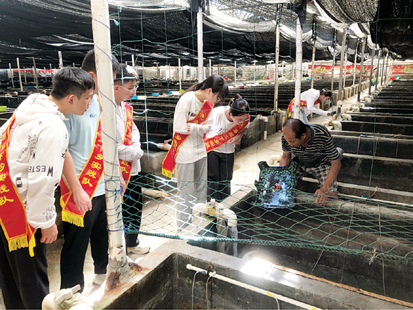 实践队前往浮叶村东禹水产养殖基地南日鲍博物馆和鲍鱼育苗养殖基地,深入了解当地特色鲍鱼文化。200多平米的馆内收藏着来自世界各地的鲍鱼标本以及各类仿制鲍鱼的陶瓷、木质艺术品,令人叹为观止。随后实践队在养殖人的介绍下观察鲍鱼培育情况,“南日鲍给我们南日岛带来了广阔的发展前景,这些年岛上的经济也因此好了很多。”养殖人周老先生如是说。