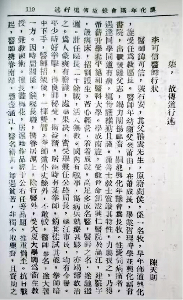 医师李可信,号石安。其父雅云先生,原籍闽侯,系一名牧,早年布道兴化,旋受任为教区长(府城教区长)。医师年幼随父来莆田,在莆成长,毕业哲理中学并兴化福育书院,出黉后继父志,竭力阐扬福音,嗣进兴化年议会为长牧。性爱伺病痛者,遇逢同学同道有病,辄侍护维勤且谨。蒲鲁士教士赏识其特征,力荐拔之,乃得带薪升学北平协和医科大学。学成南旋,受教会命创设兴仁医院于涵江,建院宇,设病床,招训护生,苦心经营,着着成就,高足多成名医,医师之名,遂驰遐迩。计任院长二十余载(一说十三年),活人无数。国内有战事,伤病兵就疗甚夥,亦竭筹救治之。为之豪爽有胆识,处事果决,尝受举兼任公路局长、涵江市长,均有令誉。