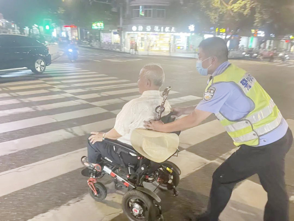 常年在路面上,只要发现群众有困难,陈国森都会毫不犹豫地伸出援手。2022年6月24日晚,陈国森在荔城中大道谊来路段巡逻时,发现一名老人坐在轮椅上,不住地用手拍打轮椅,周围也没有亲属,过往车辆较多,情况十分危险。陈国森立即上前询问。“老人家,您需要帮助吗?”见到陈国森,老人十分激动,向其说明了情况。原来,老人家住莆田学院附近,子女在外地务工。当天,老人坐着电动轮椅,独自外出。在返回途中,电动轮椅因没电“罢工”,又忘记带手机,无法与家人联系,只好停在了十字路口。“别着急啊,我送您回家!”因电动轮椅不好折叠,无法搬上巡逻警车,陈国森决定推着轮椅,步行护送老人回家。沿途都是上坡,看到陈国森推得满头是汗,老人连连致谢:“真是太谢谢你们了,幸好今天遇到你们!”