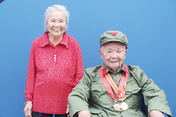 小分队抵达时,95岁的王永灯老人和家属早已等候在门口。据采访,1942年,年仅14岁的王永灯,受到邻居王秉簶、王秉鑅、王秉鈞三兄弟的影响,开始投身革命,在大洋一带为组织送情报。在一次途径何岭送情报的过程中,遇到了土匪,他先是慌称找牛骗过土匪,后又为躲避土匪,藏身于山沟下,一天一夜没吃东西,期间还被落石击中,但是他咬牙坚持将信件成功送达,回来后,自己却病倒了。在王老穿上军装的那一刻,老人及其家属,尤其是身旁的小孙女,眼里都充满了自豪。老人穿着绿军装,和爱人一起留下了珍贵的合影。