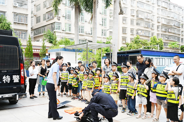 在活动现场,小朋友们在民警的引导下,参观了派出所值班室、宣传墙、社区办公室等功能区域,让小朋友对民警平时工作有了直观的认识。同时结合暑期安全,民警用通俗易懂、的语言为小朋友讲解了防溺水、反诈骗以及避免危险等安全知识,帮助小朋友进一步提高假期自我防范意识。随后,巡特警民警对部分警用装备进行现场演示,并邀请小朋友们参与体验,趣味的互动让孩子们跃跃欲试,现场洋溢着孩子们欢快的笑声。