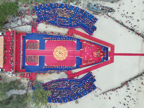海祭大典现场,伴随着大气磅礴的音乐,64位男女舞生、24位鼓手、36位封号旗手与仪仗队、仪卫队依序缓步登场,海祭大典在众人眼前徐徐展开。