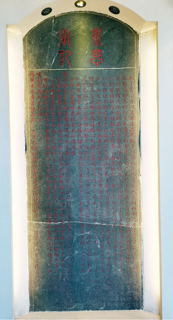 弘治二年岁在己酉(1489)秋八月吉,赐进士出身、通议大夫、刑部左侍郎邑人彭韶撰,中书舍人、直内阁、侍经筵官莱阳周文通书,征仕郎、中书舍人、直文渊阁豫章王琎篆。十六年(1503)岁癸亥八月立石。