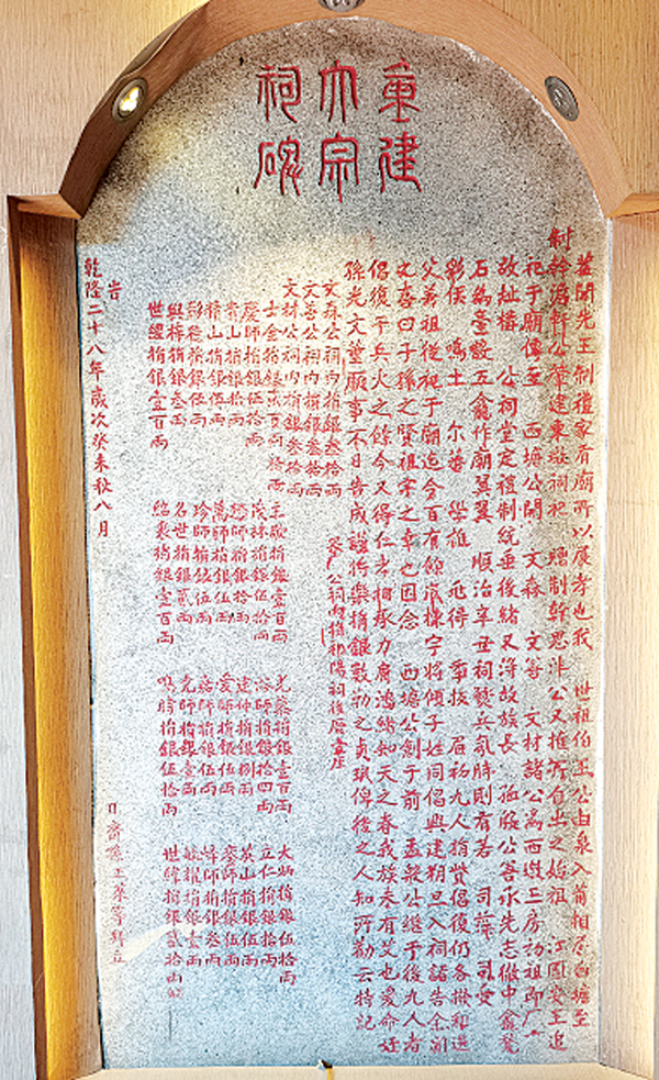 盖闻先王制礼,家有庙,所以展孝也。我世祖伯玉公由泉入莆,相居白塘。至制幹澹轩公肇建东墩祠,祀赠制幹思泮公,又推所自出之始祖江国安王,追祀于庙。传至西塘公开文森、文善、文材诸公为西墩三房初祖,即厅事故址构公祠堂,定礼制统垂后绪。又得故族长孟殷公善承先志,彻中龛,甃石为台,设五龛,作庙翼翼。顺治辛丑(顺治十八年,1661)祠燹兵氛,时则有若司藻、司受、彩侯、鸣土、尔蕃、学雄、兆得、季拔、眉初九人捐赀倡复。仍各拨租,送父若祖从祀于庙。迄今百有余岁,栋宇将倾,子姓同倡兴建,朔旦入祠诸告。余闻之喜曰:“子孙之贤,祖宗之幸也。因念西塘公创于前,孟殷公继于后,九人者倡复于兵火之余,今又得仁孝相承,力肩鸿绪,知天之眷我族未有艾也!”爰命侄孙光文董厥事,不日告成。谨将乐捐银数勒之贞珉,俾后之人知所劝云。特记:
