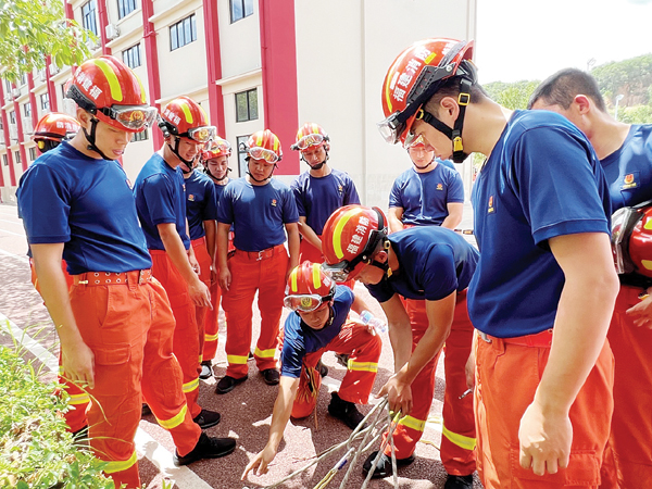 队伍各级发挥“木桶”效应,针对练兵中短板、不足开展专项练习,先后开展了绳索救援、水域救援、井下救援及门锁破拆等专题训练。训练中,全体队员严格要求自己,配合默契,互找问题,互相提高,反复实践,不断修正;训练后,指出疑惑和不足,进行复盘。同时,全体队员始终严守安全操作规程,严格落实安全措施,严防训练安全事故。