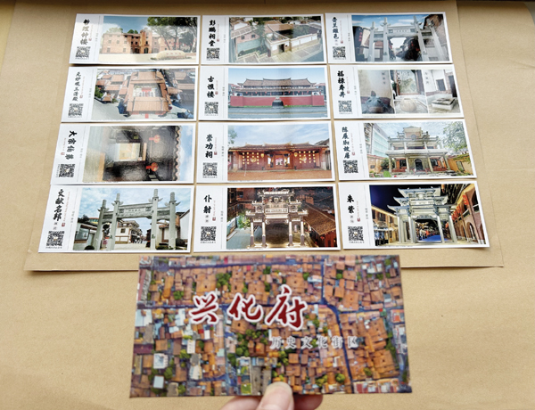 《兴化府历史文化街区》邮资明信片也在此间发行,该片1套12枚,以《马踏飞燕》普通邮资片为载体,编号为23-350304-11-0005,展现了哲理钟楼、彭鹏祠堂、壶兰雄邑牌坊、元妙观三清殿、古谯楼、福禄寿井、大宗伯第、崇公祠、陈展如故居、文献名邦牌坊、仆射牌坊和朱紫牌坊等12个人文景观。