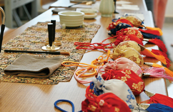 香囊是一种具有浓郁文化内涵的工艺品,是中华民族传统文化的重要组成部分。在香囊制作活动中,老师们在方芳的指导下,取5g苍术(法制为末)、5g藿香(法制为末)、3g紫苏(法制为末)、1g龙脑(别研)、1g安息香(别研)依序和匀,置于香囊囊体内,并同棉花依次放入香囊袋中,进行封口收线。老师们制作完后,将各自的香囊置于一起拍照纪念。