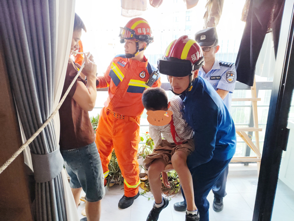 救援人员到达后发现情况比较危急,孩子两脚踩在窗边呈半蹲状,身体几乎悬空,险些掉落。救援人员立马用液压剪扩钳等工具拆开阳台防盗网将男孩从对面窗户抱回,仅用几分钟就将男童救下。