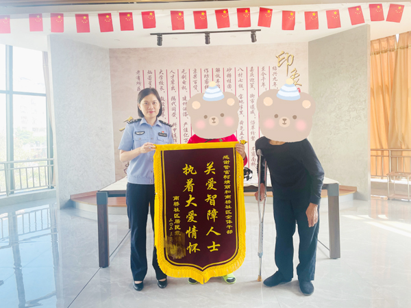 本报讯 近日,南桥社区的戴先生,将一面写有“关爱智障人士,执着大爱情怀”的锦旗,赠与了社区民警柯靖丽。