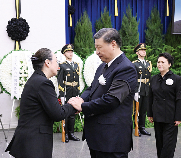 上午9时许,习近平和夫人彭丽媛,李强、赵乐际、王沪宁、蔡奇、丁薛祥、李希、韩正等,在哀乐声中缓步来到李克强同志的遗体前肃立默哀,向李克强同志的遗体三鞠躬,并与李克强同志亲属一一握手,表示慰问。胡锦涛送花圈,对李克强同志逝世表示哀悼。