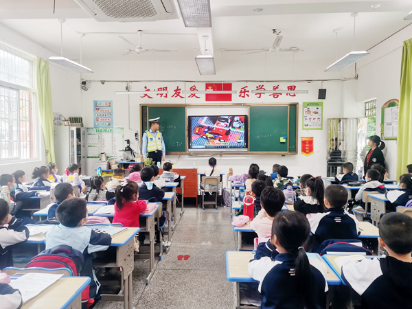 活动中,宣传民警紧紧围绕学生出行中常见的各类交通违法行为,详细讲解了交通出行中不系安全带、不佩戴安全头盔、在马路上嬉戏打闹、乱穿马路等现象,并针对学生交通安全意识淡薄、自我保护意识不强、判断能力差、好动性强等特点,叮嘱同学们养成自觉抵制交通陋习、遵守交通法规、安全文明出行的良好习惯,让交通安全知识融入每个学生心中。宣传民警还现场播放了交通安全警示教育片,希望同学们当好交通安全“宣传员”,“小手拉大手”形成合力传递,共同营造平安、和谐、有序的道路交通环境。