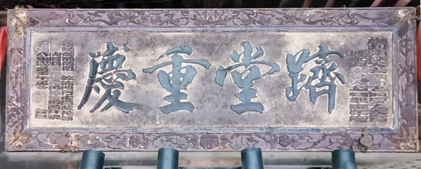 武状元黄培松题匾中间行楷书“跻堂重庆”四大字,上款“诰封朝议大夫、云衢(四世祖龙标)老伯台大人、暨德配吴太恭人七旬双寿荣庆”,下款“钦点御前侍卫、乾清门行走、赏戴花翎、庚辰科会元、状元黄培松顿首拜贺。光绪八年岁舍壬午孟冬穀旦”。