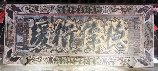 福建学政王锡蕃题匾中间行楷书“德侔卫瑗”,上款“赐进士出身、日讲起居注官、翰林院侍讲、钦命福建督学部院、世愚弟王锡蕃顿首拜贺”,下款“钦加同知衔即用清军府、研山(寿房五世祖钟豪公)先生花甲荣庆,光绪岁舍旃蒙协洽蜡月穀旦立”。