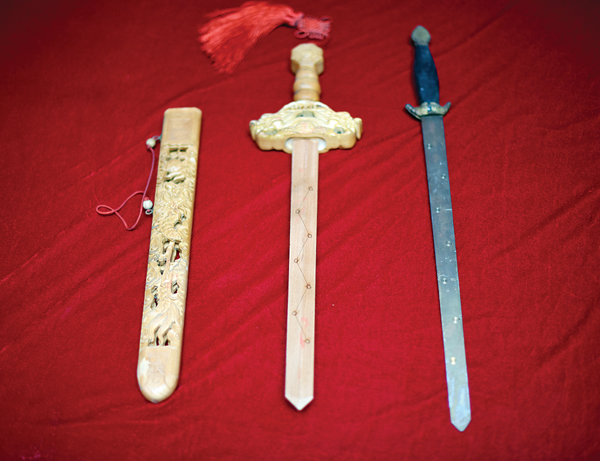 妈祖法剑:妈祖法器中的法剑又名令剑、宝剑、七星剑等,具有辟邪之用。在钢铁锻制的剑身两面,各镶有青铜制的北斗七星图样,靠近剑柄处有龙等图案。也有一种木剑,多半使用桃木雕制,又称“桃剑”。法剑有辟邪趋福、诸事随心的奇效。文峰宫内存有钢铁锻制妈祖法剑和桃木法剑各一把。