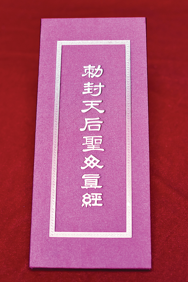 妈祖真经:文峰天后宫妈祖诵经善本,为庆贺开光告竣、吉庆活动时祭天进表、建坛诵经、祈安纳福的礼俗活动必备经典。吟诵以吟唱、念唱、说白、念诵形式进行,轻重缓急、抑扬顿挫,通过古老庄严的唱颂礼赞形式,默默传递着理想愿景与精神力量,是妈祖文化敬仰者美好心灵的证明和情感的结晶。文峰天后宫唱诵的《敕封天上圣母真经》原为清光绪辛丑年荔夏“蒲城桃洞来真书院”敬刊的版本十七章。整部“真经”文句通顺,充满哲理,扬善抑恶,予人启迪。文峰宫现所诵经书为另一部篇幅较短的《敕封天后圣母真经》,是妈祖文化敬仰者自修、自律的经书。通过诵经,加持智慧,提高文化内涵,提升道德品质。