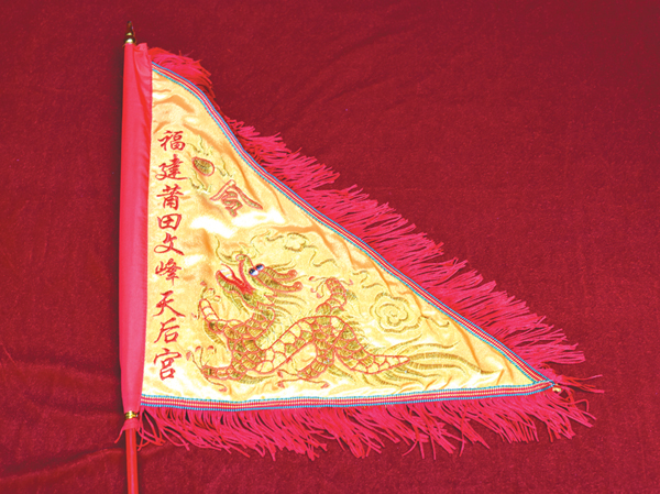 妈祖龙旗:也称令旗、五色旗等,是进行祭祀活动时的重要法器。妈祖文化敬仰者在祭坛上,设有令旗、宝剑等,从而进行祭祀活动。文峰宫常年备有特制龙旗,在文峰宫正殿请上一把龙旗带回家,挂于门头或是车上,寓意妈祖会保佑新的一年平平安安。