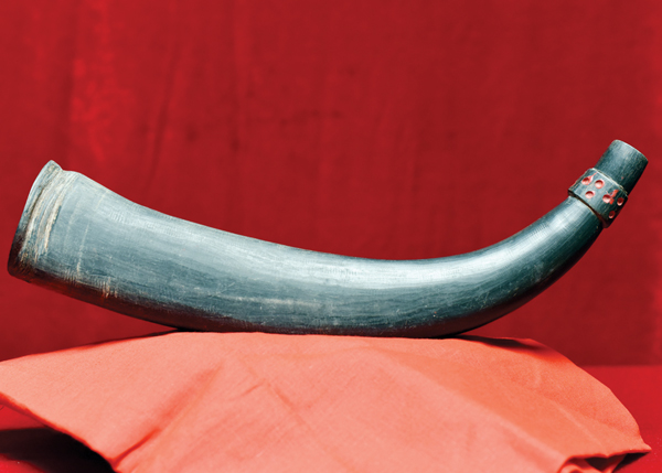 妈祖牛角:牛角多用天然生长的黄牛角或水牛角制作,常就地取材,规格大小不等,全长40厘米至70厘米,将牛角孔尖端锯平。牛角象征斗胜与辟邪,阻挡并驱除煞气。其是祭祀中的祭器,很多妈祖文化敬仰者常用牛角祭神,主要用于传递信息功能。文峰宫存有牛角一个。