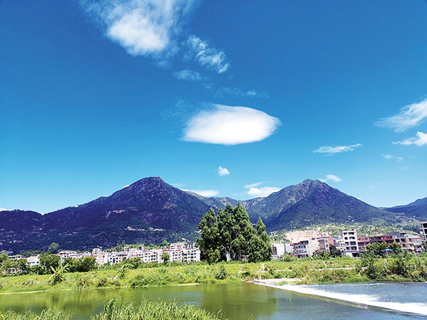 快到山顶的一段路,是坑坑洼洼的土路,有的急弯会打滑,山上开辟了一个大停车场。停好车,放眼望去,四面群山,山坳里的村庄、仙水溪,以及远处山顶的风电场一览无余,白云、蓝天,令人心旷神怡。