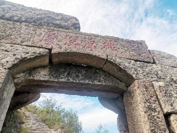 这天,山上风特别大,我和孩子“一二一”地迈着整齐的步伐拾阶而上,寺前有个条石搭建的明代石门,上面刻着“桃源深处”四个飘逸俊秀的字,据说这是唐代御赐墨宝,夸赞塔山寺为“桃源深处”。这石门就像南天门,这古寺、古塔也像是天上宫殿一般。这不只是美丽的桃源深处,更是神仙居所。