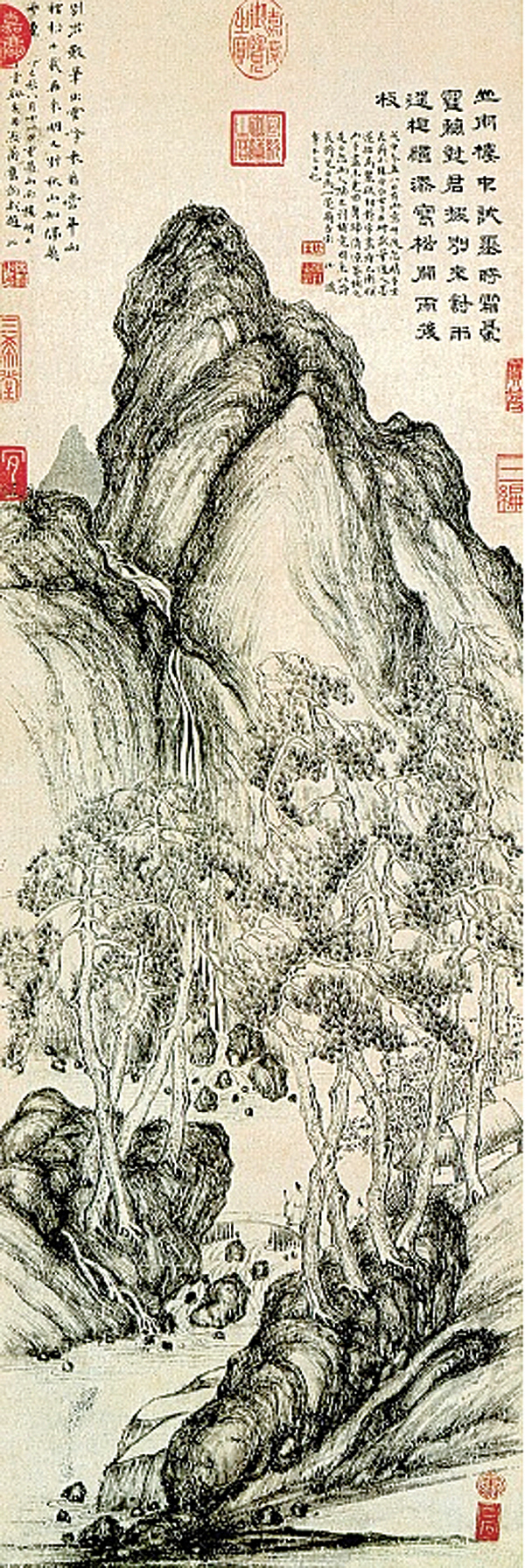 清代张庚《国朝画征录》言其临摹李公麟《辋川图》,长卷中山石纵笔作褶带皱,虽不设色,略有变通,自立新意,确实体现出传统图式的整合与变异革新的机运。
