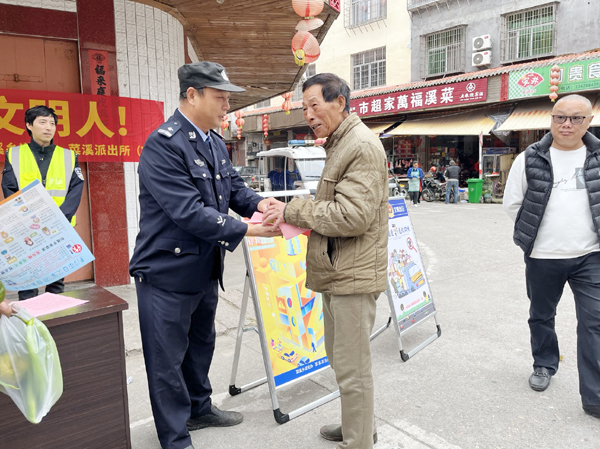 本报讯 一年好景君须记,最是橙黄橘绿时。为进一步加强辖区群众的道路交通安全意识和防范电信网络诈骗知识,近日,菜溪派出所组织民协警深入辖区主要街道开展交通安全及反诈宣传活动,同时为群众送上新鲜采摘的柑橘。
