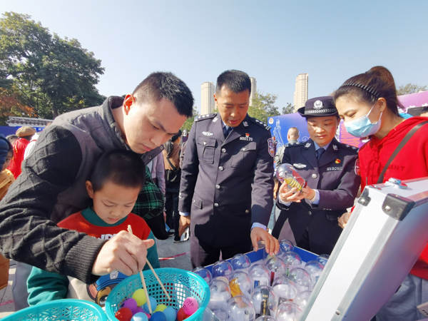 本报讯 为庆祝第四个中国人民警察节,近日,城厢公安分局深入辖区4A景区绶溪公园开展“警景相融 平安同行”主题宣传活动。在现场,禁毒民警通过布置禁毒趣味宣传语、展示毒品仿真模型、发放禁毒宣传材料等方式,为群众细致讲解新型毒品的伪装方式、特征危害及防范方法。还精心组织识“毒”乒乓球趣味游戏,用筷子夹球的方式,限时将箱子内的写有“毒品”的乒乓球尽可能多的运送到篮子中,寓教于乐,现场气氛火热,群众在游戏中潜移默化地接受禁毒教育,提升识毒、防毒、拒毒的意识和能力。(李宇逸)