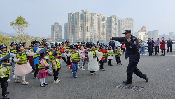 “左手握拳、右手出拳,Ha……”城厢公安分局巡特警大队的民警以寓教于乐的方式,开展“擒敌拳”现场教学。警娃们学得有模有样,过了一把“警察瘾”,直呼“太酷啦”,惊起“哇”声一片。