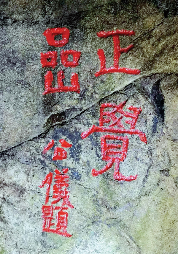 龙潭考察结束后,突然想起九座寺东北的石龛石刻落款亦是“公仪题”,于是即刻前往查看。《仙游县志》载:“伏蟒岩,在九座山,旧有蟒害人,僧智广居此,蟒化而去。”且“上有古藤,紫茎绿叶,密如藓茨”。石刻为篆书“正觉岩,公仪题”。根据陈金添先生所发雁荡山沈公仪题刻,赵贺民老师判断为同一风格,说明沈公仪在九座山共留下了两块石刻。“龙潭祈雨石刻”和“正觉岩石刻”刻于1068年至1070年间。