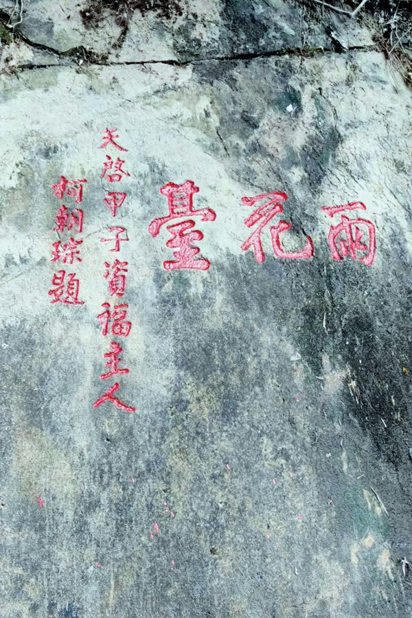 2023年10月5日,陈震辉发表《盖尾资福院明代摩崖石刻》一文,记载他们到仙游县盖尾镇聚仙村的资福院考察,偶遇七十六岁的村民柯金腾。老人见他们在给一座古代石槽拓片,不经意间提起寺院附近山里有块石刻。在他的热心引导下,找到位于山涧旁的明代摩崖石刻,距今刚好400年。此块石刻之前不见载于任何方志和其它文献,具有一定的文史研究价值和文物价值。石刻位于聚仙村石牌后自然村资福院西偏南约200米处的溪涧第二潭旁的一块天然石台,石台旁有块表面平整的崖壁,上面刻着三个大字“雨花台”,落款小字“天启甲子资福主人柯朝琮题”,石刻幅宽约1.2米,幅高约1米。