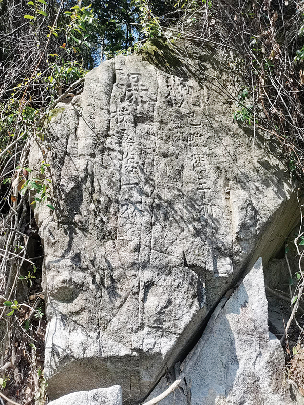 2023年7月3日,柯伯雄、柯美中、沈国钦三人来到新县村下仙井过去上面的寨埔山腰中,探寻几个小时才发现一块大石上刻一方明代天启七年(1627)正月的古崖刻,正中刻“杨后山”三大字,右左边刻小字落款“天启七年丁卯正月吉旦,大明孝男孙居、孙责、孙荣、孙禄泣立”。