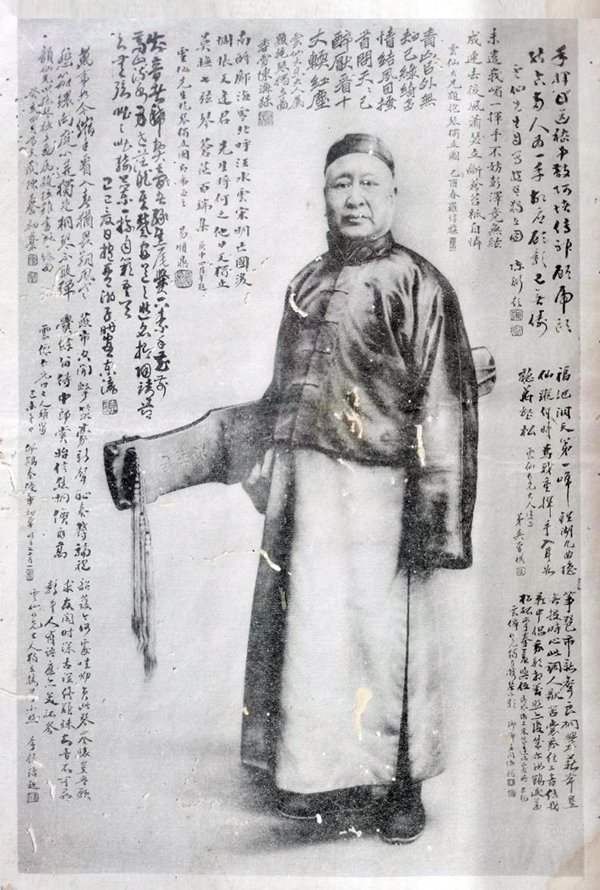 此外,照片上有一些名人诗题,分别是“福地洞天第一峰,鲤湖九曲隐仙踪。何时为我重挥手?入耳如听万壑松。云仙仁兄大人嗄正,弟吴曾祺”;“青山以外无知己,绿绮多情结夙因。搔首问天天已醉,厌看十大软红尘。云仙大兄属题抱琴独立图,香雪陈海槑”;“南酹邝海雪,北呼汪水云。宋明亡国后,惆怅又逢君。先生将何之,他日又独立。莫抚七弦琴,苍茫百端集。云仙先生抱琴独立图即希正之,易顺鼎”;“韶护今何处,哇咿负此琴。卷怀岂吾顾,求友阅时深。古谊终难睐,知音不可寻。影中人有语,应亦笑孤岑。云仙仁兄大人独立携琴小照,李钟瑨题”;“筝琶市新声,良桐爨薪斧。岂无投时心,此调人猒苦。囊我弦上音,结我影中侣。我影相对照,亦复成尔汝。鹤泪羡松孤,孪拳羞与伍。 清风海上来,成连何处所。右题云仙仁兄独立携琴小影,琅瑘王同海稿”;“手挥目送嵇中散(嵇康),阿堵传神顾虎头(顾恺之)。结合两人为一手,故应顾影己无俦。云仙先生自写抱琴独立图,陈衍题”等。
