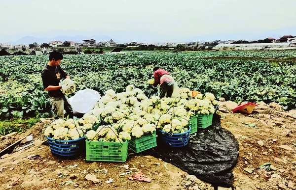 本报讯 近日,在仙游县大济镇大济社区的村道上看到,大片蔬菜田里,一株株花菜苗枝叶茂盛,结满一朵朵白色花菜,许多员工正忙着砍收花菜,好一派丰收在望的景象。据员工们介绍,这片花菜是江西老板种植户陈金明承包种植的,今年大丰收。