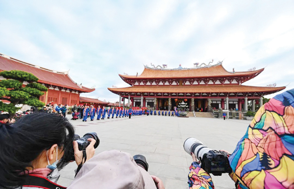 活动现场,快门声此起彼伏,众人围绕“晨拜妈祖·诵经祈福”仪式、湄洲女、殿宇等题材进行拍摄,用镜头记录下湄洲妈祖祖庙浓厚的妈祖文化氛围和深厚的民俗底蕴。