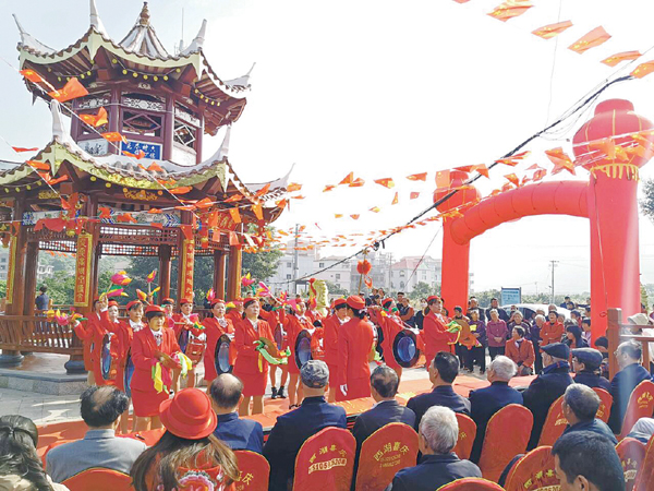 本报讯 元旦,风和日丽。城厢区华亭镇走马亭村地标走马亭落成庆典在村里举行。早上9时不到,阳光明媚,村里的老人们坐在“走马亭”里拉家常,孩子们绕着两匹金色骏马左看看、右摸摸,三三两两路过桥头的村民,不时驻足观看。溪边微风习习,亭边热闹非凡。