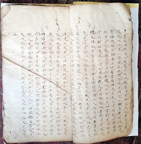 2020年7月31日下午,笔者随城厢区文联组织的“家园记忆”文化采风团一行来到东海镇蔡亭村,在山前133号陈荣土家看到一本其母亲保存的古本,系先祖陈文标于清康熙、雍正年间所著文集(手抄本,缺损)一本、诗集(破损严重,已不能翻动)一本以及陈文标及后人续编的《寿山陈氏家谱》一本,都非常珍贵,其中文集(手抄本)是研究莆仙主要景点及风土人情的重要史料。游记部分有《游紫霄岩记》《游狮峰岩记》《游石梯山寺记》《游鼓山涌泉寺记》《新九鲤仙宫记》《游石室记》《游城峰禅寺记》《如意松记》《游名峰岩记》《游麦斜岩记》《游西明禅寺记》《游城西叶亭记》《双寿承恩记》;记有《重兴水月庵记》《玉湖宁静斋记》《重兴占龙宫记》《名立户陈景南记》《列代祖茔记》《家世善事记》《紫图山祖茔记》等。此外还作有《祥禾颂》《请示禁赌呈词》《慎言训词》《遗训》《训子词》《慎终训词》《戒比匪训词》《笔铭》《墨铭》《砚铭》《杖铭》《镜铭》《改葬鸡山祖茔志铭》《牛山父茔志铭》《刘殿伯节母附葬祖母墓志铭》《观音亭叔茔志铭》等篇。