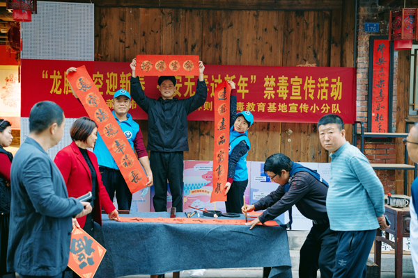 在现场,禁毒社工设置禁毒三字经展板、禁毒标语,为过往群众发放禁毒宣传单,向大家介绍毒品种类、危害和防范方法,引导大家自觉抵制毒品,向毒品说“不”。禁毒社工和群众挥毫泼墨,妙笔生花,一张张红彤彤、喜洋洋的春联承载新春祝福和无毒愿景,在浓厚的节日气氛中共筑禁毒防线。(李宇逸)