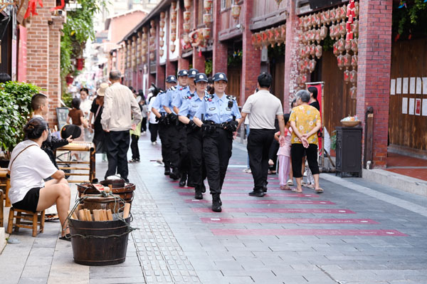 景中有警、警随景动。兴化府文化街区、益田假日广场、金鼎广场……假期里的镇海辖区商圈人流车流络绎不绝,警蓝身影或坚守或巡护,日夜不息。国庆期间,镇海派出所结合节日治安规律特点,加大警力投放、强化显性用警,针对辖区假日人员密集点位,分时段分区域科学调整巡防勤务,落实“见警车、见警灯、见警力”措施,最大限度将警力部署在一线,为辖区群众和游客保驾护航,让镇海辖区的平安底色更足。