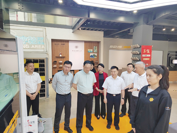 2024年4月22日,民进中央副主席何志敏来莆开展重点课题调研,图为参观双驰实业股份有限公司个性化定制生产车间。