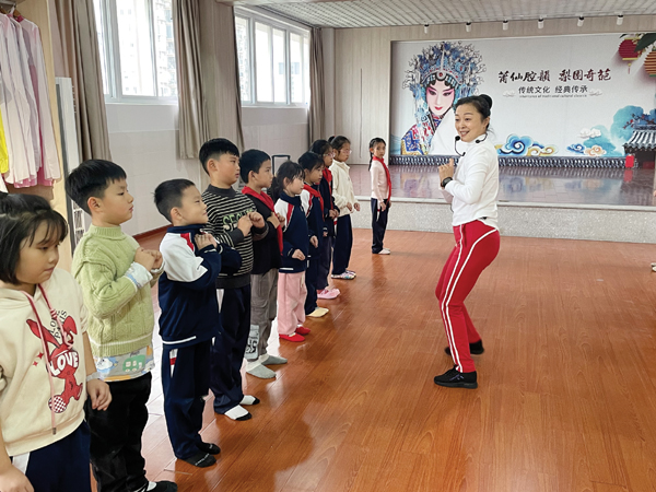 2023年12月15日,仙游县支部会员张顺在仙游县鲤南中心小学教学生表演莆仙戏。