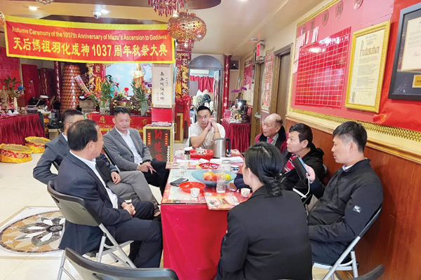 当地时间10月19日下午,林金赞一行前往美国妈祖庙参访,与庙方负责人及妈祖敬仰者亲切交流,深入了解美国妈祖庙在日常活动组织、信众服务及文化推广方面所做的努力和取得的成绩,对他们在异国他乡坚守和弘扬妈祖文化的精神表示高度赞赏。美国妈祖基金会创会主席黄升发是美国妈祖庙的发起人,他分享了该庙于2014年设立期间发生的许多神奇的故事。他表示作为妈祖文化在美国纽约的重要传播据点,美国妈祖庙每年都会举办纪念妈祖诞辰、妈祖羽化升天等节庆活动,让更多的人了解和认识妈祖文化,不断促进妈祖文化的传承与发展。