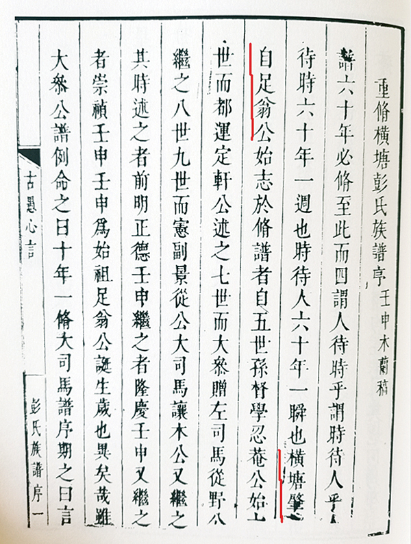 另据清代康熙朝横塘彭鹏(今黄石七境钱塘自然村人)重修祠堂,石门额题刻“横塘彭氏宗祠”,而不用“小横塘彭氏宗祠”,详见横塘彭鹏所著《古愚心言》载《重修横塘彭氏族谱序(壬申木兰稿)》一文摘录:“……横塘肇基,自足翁公始。……十世孙鹏重修《横塘族谱》,特序此。”《横塘彭氏宗祠春祀记(辛未十月木兰稿)》一文摘录:“横塘宗祠合祀承先志也。……盖自吾(按:‘吾’指彭鹏)家以横塘为大宗,于义(房)则隘,鹏易祠额曰:‘彭氏宗祠’(全称:横塘彭氏宗祠)。”祠堂至今尚存,位于黄石七境钱塘自然村300号。